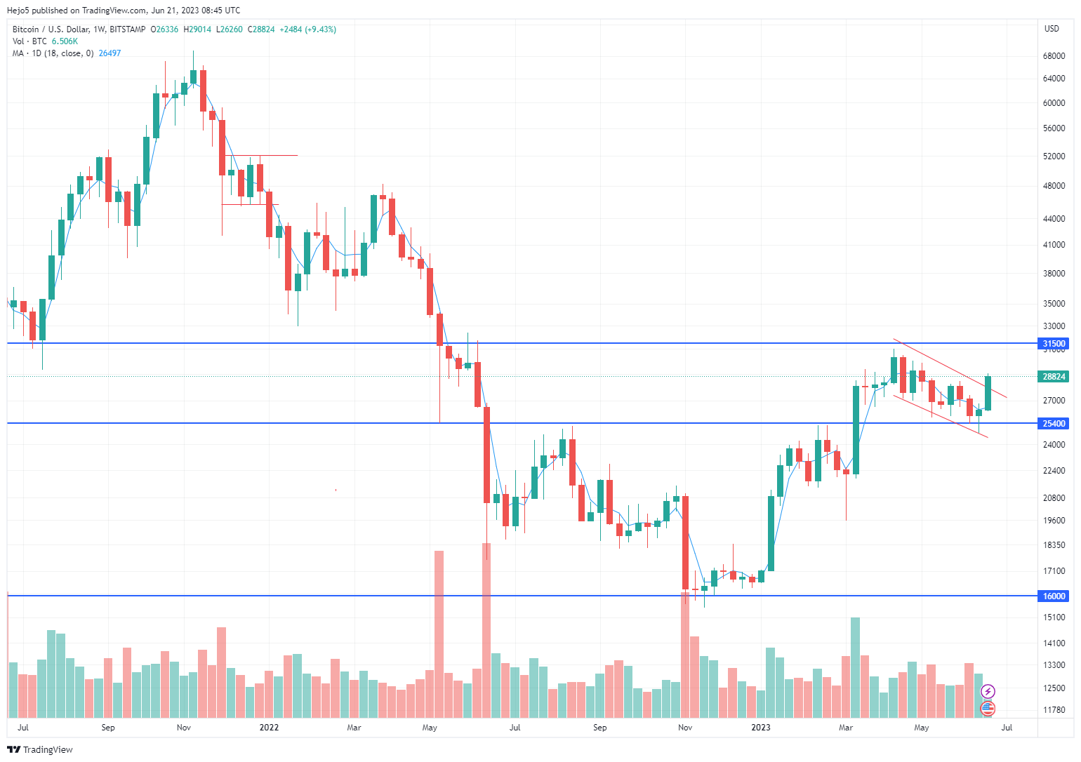 Chart-technisch hat die invertierte Head&Shoulder-Struktur der vergangenen Monate gehalten, und wir sehen einen falling wedge (bullish).